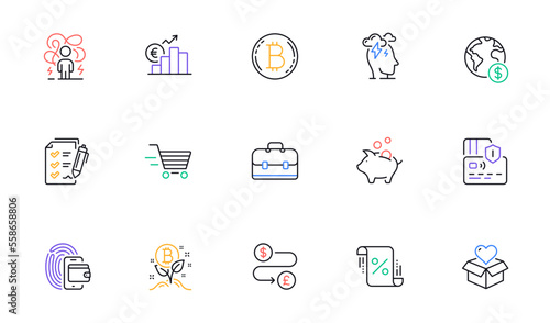 Loan percent, Bitcoin project and Difficult stress line icons for website, printing. Collection of Card, Portfolio, Wallet icons. Piggy bank, Survey checklist, Bitcoin web elements. Vector