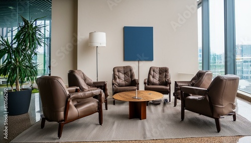Lobby interior with armchairs in row and coffee table, window. Mock up wall