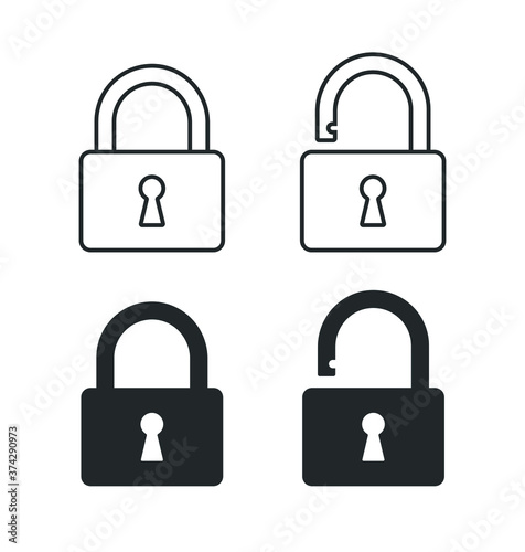 Lock and unlock icon. Padlock open and closed sign. Log in and log out symbol. Security access logo. Vector illustration image. Black silhouette shape isolated on white background.