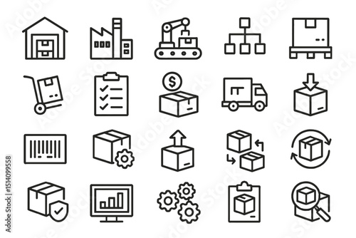 Logistics and supply chain management icons depicting warehouse, transportation, and inventory processes with clarity and simplicity