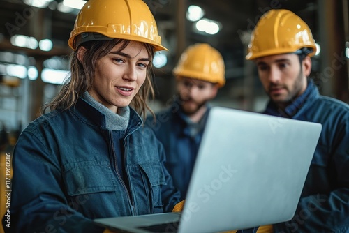 Logistics Center Meeting with Industrial Workers Collaborating on Laptop