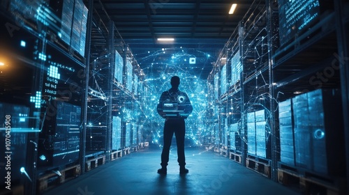 Logistics coordinator, surrounded by digital and technological symbols icons, cargo handling efficiency