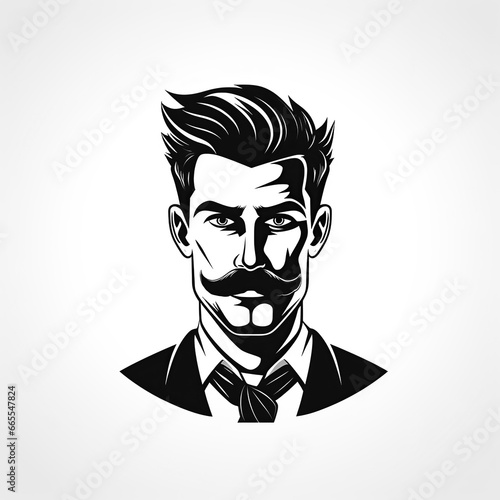 logo with face of a man with a mustache in a suit and tie on a white isolated background. An emblem for a stylish fashionable men's store or clothing brand