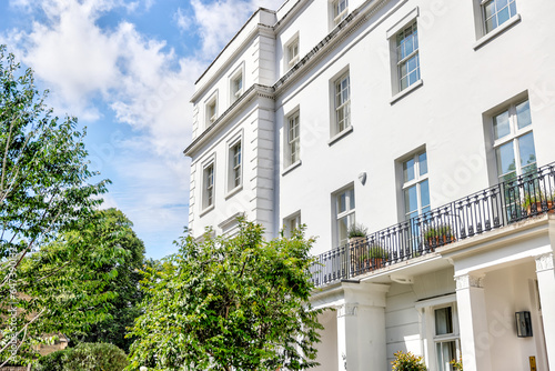 London, England - July 11, 2023: Walk up apartment buildings in Mayfair and Knightsbridge seen from the street in London