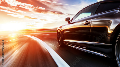Lone car driving on deserted highway at sunset, road stretching into horizon with golden light reflecting off hood, sharp silhouette against vibrant sky, emphasizing solitude and freedom.
