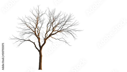Lone deciduous tree, stark branches against pure white, twig, high resolution