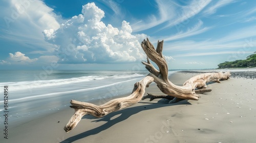 Lone driftwood resting on a deserted beach, adding a touch of rustic charm to the coastal scenery