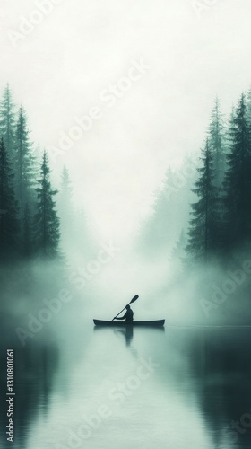 lone kayaker glides through serene misty lake surrounded by tall pine trees, evoking tranquility