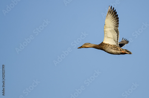 Lone Mallard Duck Flying in a Blue Sky