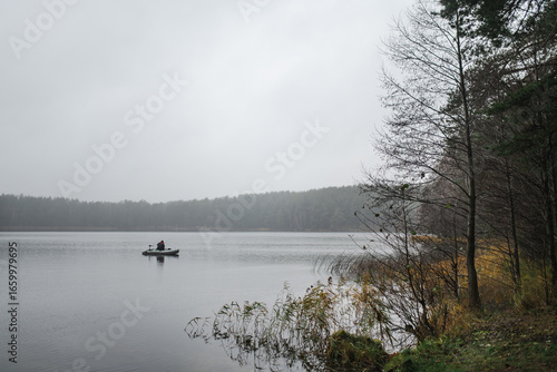 Lone person fishes quietly from a small boat on Balzis Lake, surrounded by mist, reeds, and dense forest under a gray sky