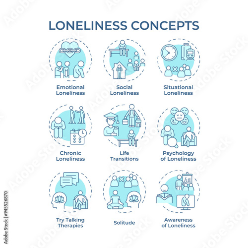 Loneliness soft blue concept icons. Psychology science, mental health. Socializing, relationships. Icon pack. Vector images. Round shape illustrations for infographic, presentation. Abstract idea