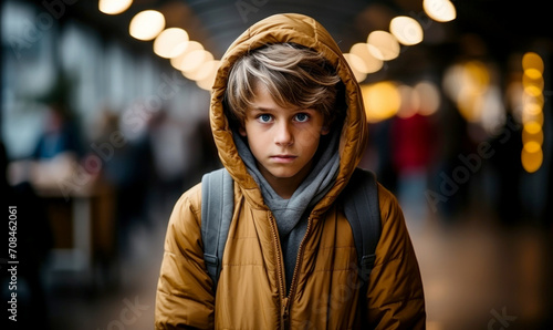lonely teenage boy in yellow hooded jacket standing in a dark subway station with a frightened look, concept of difficulties in adolescence, intransigence, protesting