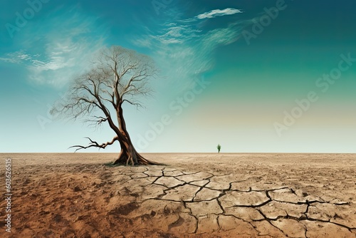 Lonely tree on drought crack land. Climate change concept. Generative AI