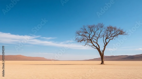 Lonely Tree Standing Amidst a Vast Desert Landscape Under a Clear Sky : Generative AI