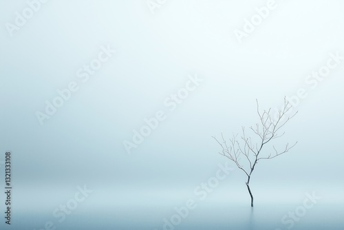 Lonely tree stands in fog-covered water creating serene and tranquil atmosphere at dawn