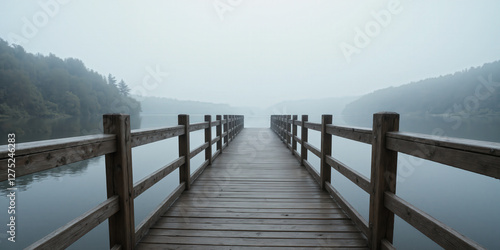 Lonely wooden bridge over a misty river for tranquil and meditative visuals. A weathered wooden bridge arches gently over a calm, mist-covered river.