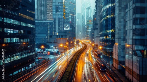 Long exposure captures the vibrant streaks of light from cars in the bustling night traffic of a modern cityscape.