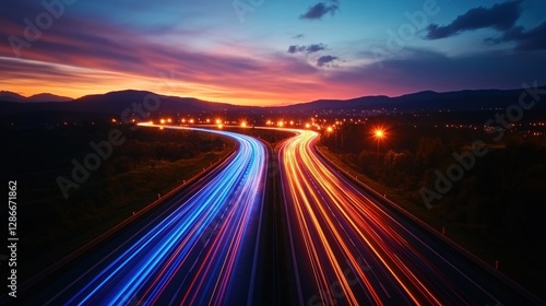 Long exposure night photograph of dynamic light trails on a busy highway with dark sky and blurred motion