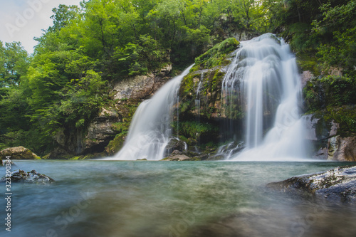 Long exposure of magical looking Virje waterfall in Slovenia, close to bovec. Dreamy and enchanting water falling down the cliff above the small alpine lake.