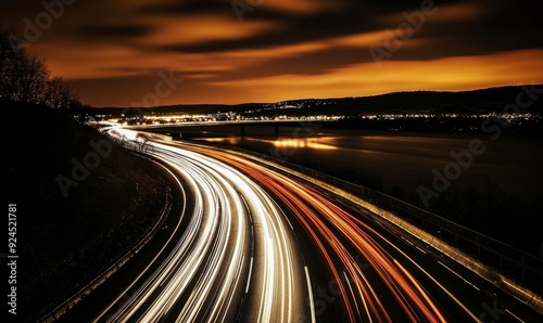 Long exposure photograph of car light trails on the highway at night with a river in the background.