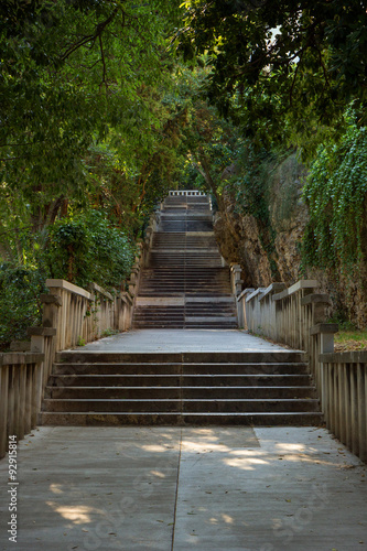 Long flight of stony steps to the Marjan hill surrounded by trees in Split, Croatia.