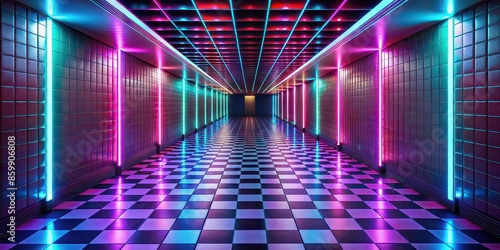 Long hallway with checkered floor and neon lights , hallway, checkered floor, neon lights, vibrant, empty, modern, corridor, indoor, pattern, design, abstract, illuminated, brightly lit