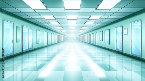 Long Hospital Corridor, Bright Lights, Clean, Modern Design, Medical Background