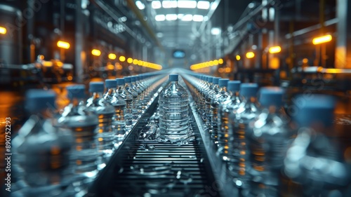 Long industrial factory production line with plastic water bottles, illuminated by bright lights, emphasizing large-scale manufacturing and automationindustrial