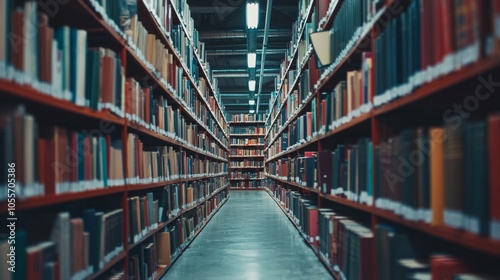 Long narrow library aisle lined with books on both sides