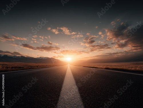 Long open road stretching into horizon at sunset with dramatic cloudscape and warm glow