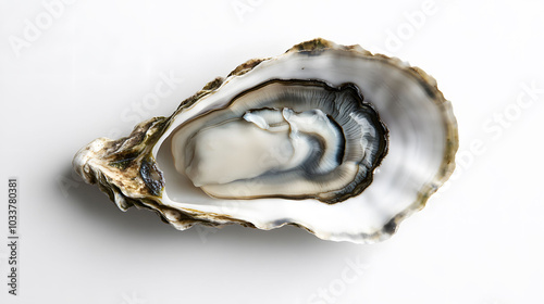 Long oyster displayed from above on clean white surface, showcasing its unique shape and texture in a minimalist setting