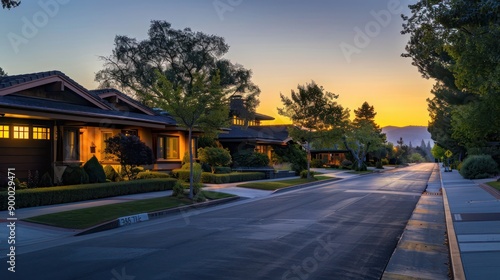Long street view at dawn focusing on a Craftsman style house, street lined with well-maintained sidewalks and trees