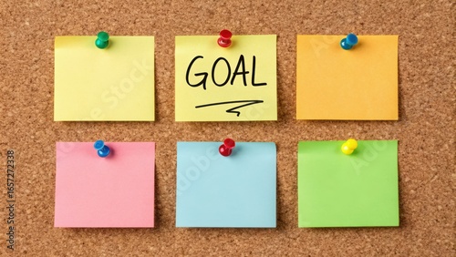 long term student goals concept. Colorful sticky notes on corkboard with the word "GOAL" highlighted.
