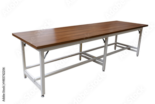 Long wooden table with metal frame, isolated on black background Concept of furniture, industrial design, and workspace