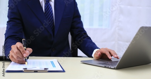 Looking at busy businessman's hands Using smartphones and laptops in the office, AI creates images.
