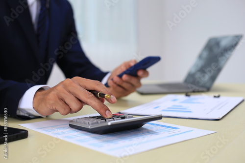 Looking at busy businessman's hands Using smartphones and laptops in the office, AI creates images.