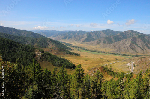 Looking from the top to the valley in the mountains which the paved road crosses, I make a wide turn.