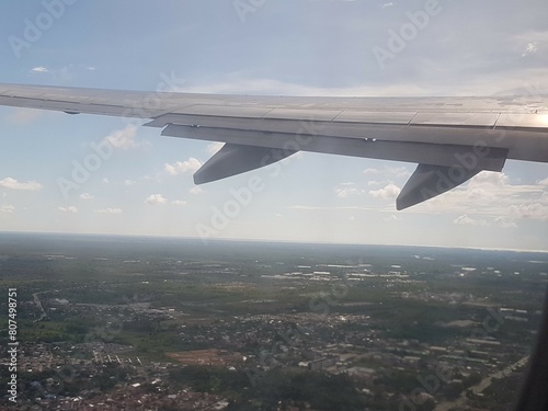 Looking through window aircraft during flight in wing with a nice blue clear sky and beautiful clouds. flying and traveling, view from airplane that can see outside.