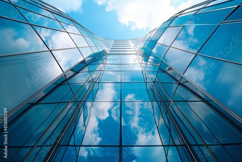 Looking up at a modern glass skyscraper, reflecting the clear blue sky and clouds, symbolizing ambition and progress.
