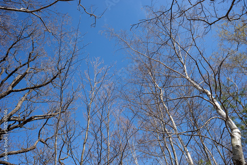 Looking up at the branches of deciduous trees in spring with a blue sky in the background