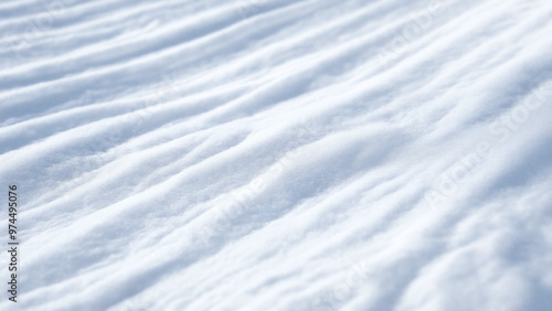 lose-up of snow-covered ground, the texture of fresh white snow, visible ripples and contours.
