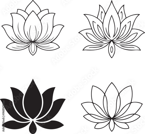 Lotus flower silhouette & Outline set vector illustration isolated On Transparent Background