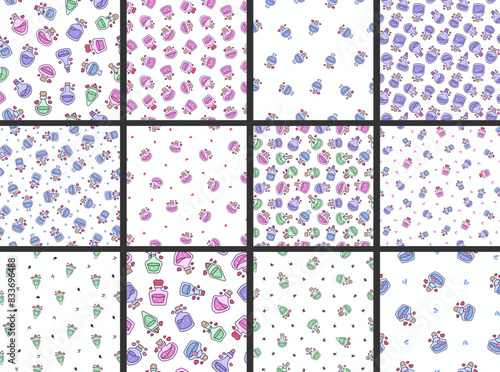Love potion. Seamless pattern. Stoppered glass bulb with heart. Aphrodisiac flask. Valentine's day. Hand drawn style. Vector drawing. Collection of design ornaments.