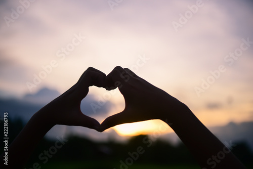 Love sign Heart shape hand silhouette in sunset sky background.