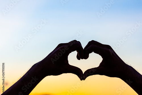 Love sign. Heart symbol by hand silhouette in sunset sky
