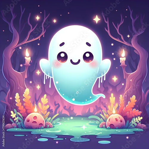 Lovely cute glowing ghost in a magical swamp animation style character.