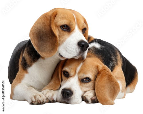 Loving beagle dogs cuddling together, showcasing their affectionate bond and playful nature. Their expressive eyes and soft fur create heartwarming scene of companionship and joy