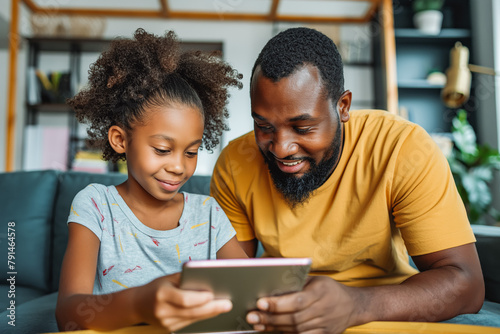 Loving father and daughter using tablet at home while resting comfortably on the sofa