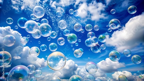 Low Angle View of Soap Bubbles Floating in Blue Sky with Clouds, Multiple Bubbles, Sky Background, Dreamy Concept soap bubbles, sky, photography
