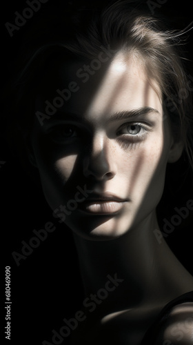 Low saturated artistic portrait of a model. The image is characterized by a dramatic play of light and shadow, with a focus light cast.